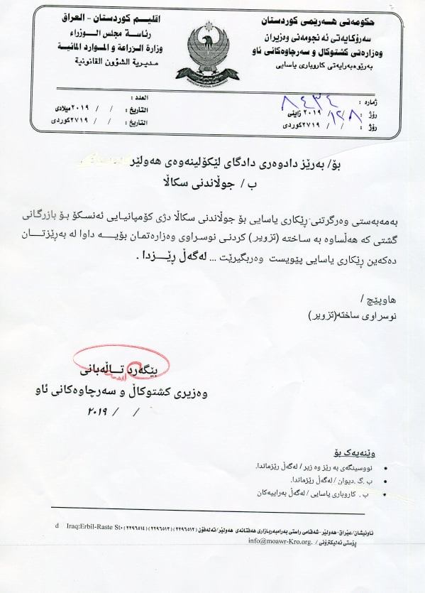 وەزیری کشتوکاڵ و سەرچاوەکانی ئاو، داوایەکی یاسایی لە دادگا تۆمار کرد لەدژی ئەنجامدەرانی کاری ساختەکردنی نووسراوی وزارەتەکە بۆ مەبەستی هاوردەکردنی دووگ (دوونگ)ی بەستوو. ئەمڕۆ 2019/12/8 بێگەرد تاڵەبانی، وەزیری کشتوکاڵ داواکارییەکەی پێشکەش بەدادگای لێکۆڵینەوەی هەولێر کرد و دادگاکە دواکارییەکەی وەرگرت. لە داواکەدا وەزیری کشتوکاڵ داواکارە دادگا ڕێکاری یاسایی بەرامبەر بە ئەنجامدەرانی ساختەکارییەکە بگیرێتە بەر. ئەم داوایەی وەزیری کشتوکاڵ دوای ئەوە هات کە ئاشکرابوو، لەسەر کڵێشەیەکی ساختە و لەیەکنەچوو لە کڵشەکانی وەزارەتی کشتوکاڵ و سەرچاوەکانی ئاو و پڕ هەڵەی تەکنیکی و ئیداری و بە ئیمزای ساختەی وەزیری کشتوکاڵ داوا لە بەڕێوەبەرایەتی گومرگی باشماخ کراوە مۆڵەت بدەن بە هاوردە کردنی دەهەزار تەن دووگی بەستوو، کەزیاتر لە دە ساڵە بە گوێرەی یاسای کەرەنتینەی کشتوکاڵی هاوردە کردنی بۆ عیراق و هەرێمی کوردستان قەدەغەیە.