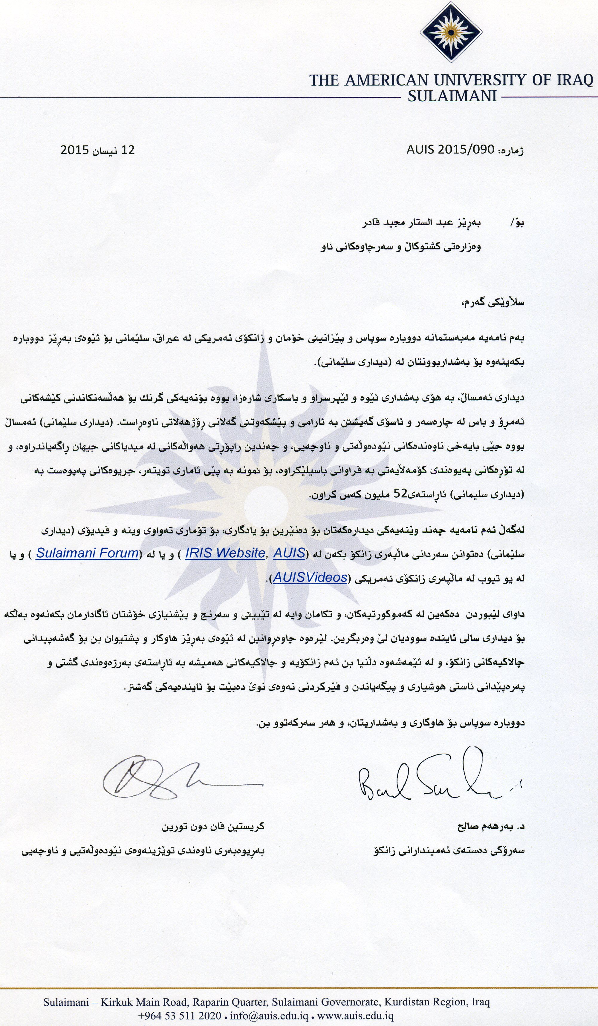 بەڕێز دكتۆر بەرهەم ساڵح سەرۆكی دەستەی ئەمیندارانی زانكۆو كریستین فان دۆن تۆرین بەڕێوەبەری ناوەندی توێژینەوەی نێودەوڵەتی و ناوچەیی سوپاس و پێزانینی خۆیان و زانكۆی ئەمریكی لە عێراق – سلێمانی ئاراستەی بەڕێزعەبدولستار مەجید وەزیری كشتوكاڵ و سەرچاوەكانی ئاو كرد بۆ بەشداری كردنی لە دیداری سلێمانی كە ماوەیەك لەمەوبەر لە شاری سلێمانی بە بەشداریی ژمارەیەكی زۆری سیاسەتمەدارو ئەكادیمی و توێژەرو پسپۆڕو مامۆستایانی زانكۆكانی كوردستان و عێراق و جیهان بەشداریان تێدا كرد، تێیدا هاتووە كە بەشداریتان بووە هۆی بۆنەیەكی گرنگ بۆ هەڵسەنگاندنی كێشەكانی ئەمڕۆ چارەسەركردن و ئاسۆی گەیشتن بە ئارامی و پێشكەوتنی گەلانی رۆژهەڵاتی ناوەڕاست