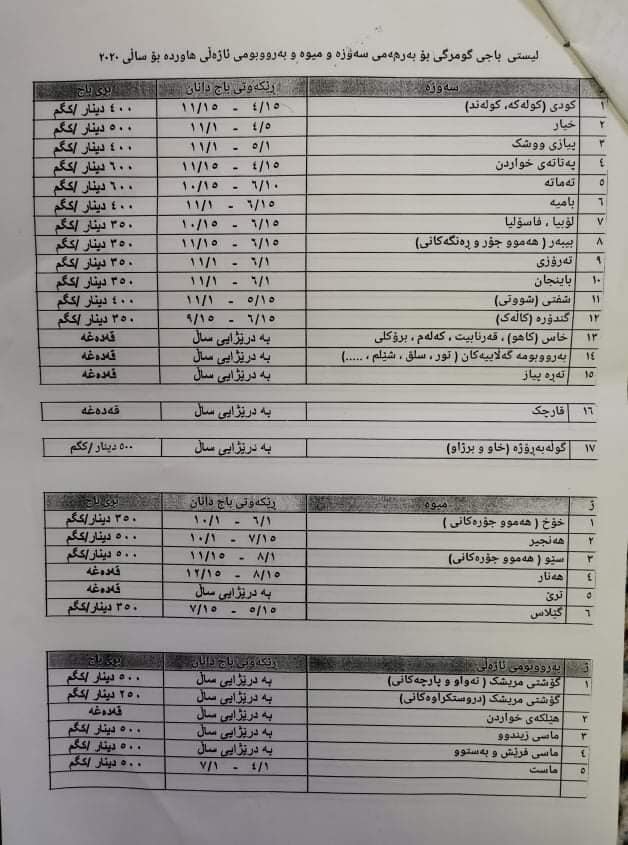لە ئێستادا لە وەرزی پێگەیشتنی بەشێكی بەرهەمی ناوخۆیداین، گلەیەکانتان لەسەر نزمی نرخ مافێكی رەوای خۆتانە لە بەندەو وەزارەتەكەی خۆتان، ئەركمانە گوێتان لێ بگرین و سەرنجەكانتان رەچاو بكەین و پارێزەرتان بین. جوتیاران لە 2020/3/10، نوسراومان بۆ بەڕێوەبەرایەتی گشتی گومرگ لە وەزارەتی دارایی و ئابووری كردووە لیستی هەموو بەرهەمەكان كە قەدەغەن یا باجیان لەسەرە بۆمان ناردوون. تایبەت بە كودی(كولەكە، كولەند) لە 15/4 تاوەكو 15/11 بۆ هەر كیلۆیەك 400 دینار باجمان لەسەر داناوە ئەمەش لە پێناو پاراستنی بەرهەمی خۆماڵی، ئەگەر پێویستی کرد باجی زیاتریش دەخەینە سەر. كەرەنتینەكانمان لە دەروازەكان، فەرمانبەرانمان لە عەلوەكان و لیژنەكانی چاودێری بازاڕ راسپاردوون وردتر و جدی تر چاودێری بەرهەمی قەدەغەكراو بكەن. رۆژانە چاودێری نرخی سەوزە و میوە دەكەم، ئەمڕۆ شەممە پەیوەندیم بە سەرجەم عەلوەكان كردووە کە ئایا كودی هاوردە بوونی هەیە، دڵنیا بوومەوە كەتەنها کودی ناوخۆی بوونی هەیە. هۆكاری نزمبوونەوەی نرخ دوو خاڵە، یەكەمیان خستنە بازاڕ زیاترە لە خواست، دووەمیان بەشێوەیەكی گشتی خواست لەسەر هەموو بەرهەمێك كەمی كردووە. جوتیارانی ئازیز، لە ئێستادا بەرهەمی خوارو ناوەڕاستی عێراق پێگەیشتووە بۆیە هەرچەندە دەرگای بازاڕی ناوەڕاستی عێراق بۆ بەرهەمتان واڵایە، بەڵام بەهۆی پێگەیشتنی بەرهەمی ئەوان بازاڕەكانیان پێویستیان بە بەرهەمی ئێمە نیە. كاری جدی دەكەین بۆ هەمەجۆركردنی بەرهەم و دۆزینەوەی بازاڕ، لێرەشەوە داوا لە ئێوەی بەڕێز دەكەم بایەخ بە هەمەجۆركردنی بەرهەم بدەن بۆ ئەوەی لەكاتی ساغكردنەوە زیانتان بەر نەكەوێت. بێگەرد تاڵەبانی وەزیری کشتوکاڵ و سەرچاوەکانی ئاو 2020/5/9